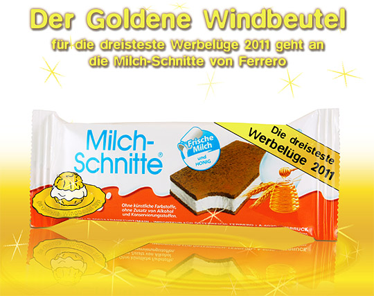 Milchschnitte. Dieser Kinder-fresst-euch-bitte-dick-Riegel wird vor allem von schlanken jungen Damen beworben, die nach dem Sport kollektiv und unverschwitzt eine federleichte Mahlzeit einnehmen wollen. Dabei hat der Schmutz mehr Zucker und Fett intus, als eine nette Portion Schoko-Torte. Na dann, lassts euch schmecken, Mädels. Ganz nebenbei sollte bemerkt werden, das man sich als Werbe-Schauspieler mit in die Lügerei hineinziehen lässt, billig-grinsender Handlanger der Werbeindustrie wird.