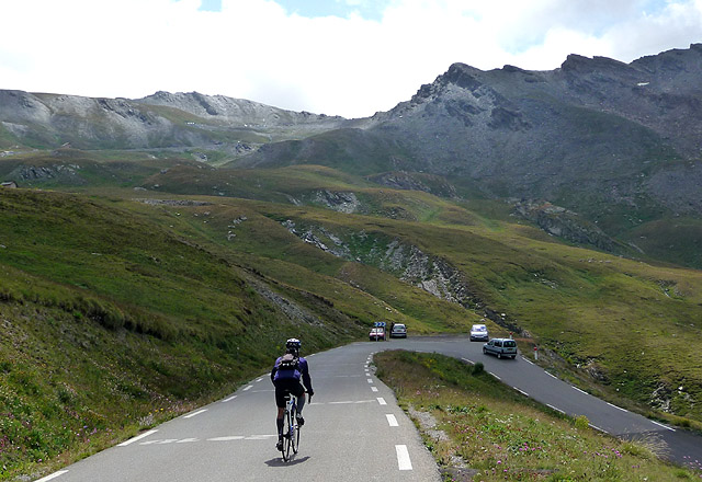 Blick zurück auf die Passhöhe, die sich in dem Bergdurchbruch in der Mitte des Bildes befindet.