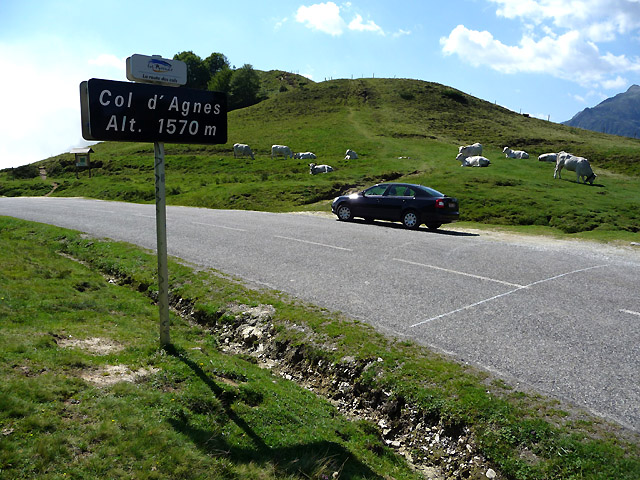 Die Westrampe beginnt links im Bild, die Nordrampe rechts. Die Kühe haben auf der Passhöhe freien Lauf, können somit auch auf der Straße oder auf dem kleinen Parkplatz herumtigern.