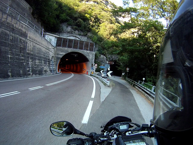 Blick auf die südliche Tunneleinfahrt und den kleinen Weg, der rechts am Tunnel vorbei führt. Ein deutlich zu sehendes Durchfahrt-Verboten-Schild rechts im schattigen Bereich macht aus der vermeidlichen Ausweichroute leider einen Fahrrad- und Wanderweg.