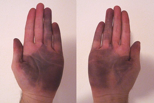 Beide Hände waren schwatz. Aber halt nicht überall, sondern nur an den Stellen, an denen der Handschuh aus Leder besteht. Nun gut, einmal gründlich händewaschen sollte wohl reichen.