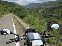Im Süden ist es ehr schluchtig, gleich zu Beginn bei Berdun kommen die heftigsten Abschnitte. Senkrechte Wände gleich neben der Straße, enge Bergeinschnitte, dem dazugehörigen Fluß nur wenige Meter unterhalb der Straße, und kleinen Tunnel. Sehr schön anzusehen und zu fahren, auch wenn der Belag sehr hubbelig ist. Tal, Schlucht, Natur, 25 Kilometer so gut wie kein Verkehr, das hat was. Zudem lässt sich die Strecke sehr gut mit der durch die Sierra de San Miguel(i) verbinden, die besseren Asphalt und dichten Wald bereit hält.
