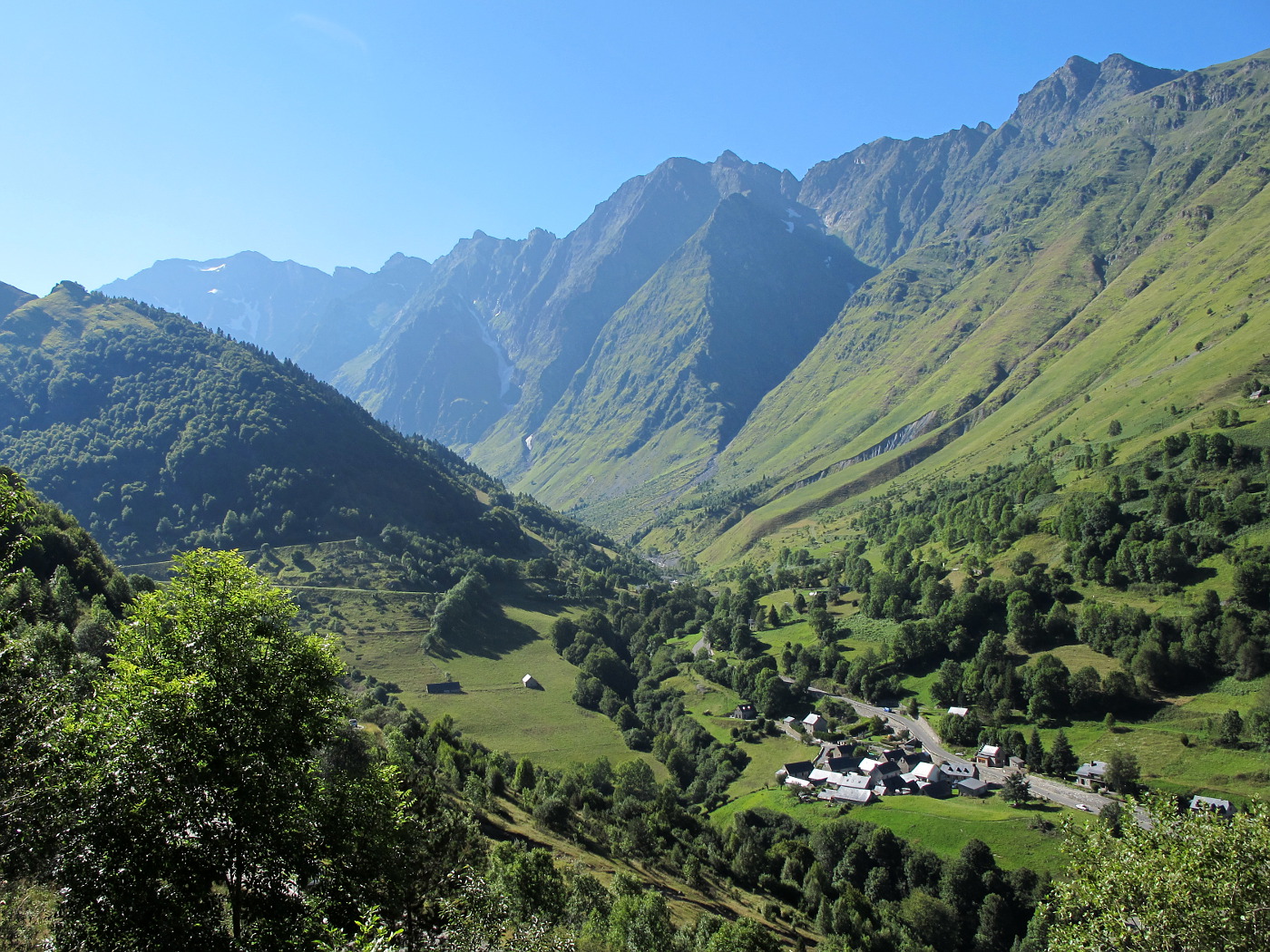Die unten rechts noch sehr breite Straße macht in der Bildmitte einen Schlenker nach links und wird gleich auch etwas schmaler und schlechter. Die Häuser dürften die nödlichsten Gebäude des rechts außerhalb des Bildes liegenden Ortes Aragnouet sein.
