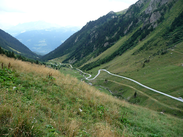 Links im Bild ist der kleine Ort Laval zu sehen, der sich in der Mitte der Südrampe befindet. Erstellt wurde das Bild auf den ersten Metern der Schotterpiste. Die kleine Betonbrücke, die Asphalt und Schotterweg voneinander trennt, befindet sich etwa 200 Fahrmeter rechts außerhalb des Bildes.