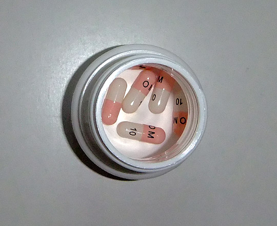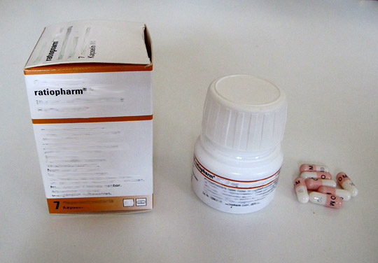 Riesen Paket, hinter dem man fast einen Tennisball verstecken kann, darin eine extrem stabile Tupperdose aus panzerbrechendem Spezial-Kunststoff, und das für gerademal 7 kleine Pillchen. Schon als mir der Apotheker das Paket in die Hand drückte, meinte ich "