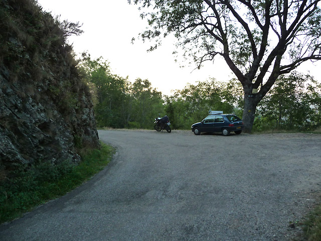 Hinter dem Betrachter befindet sich die Brücke auf der Passhöhe, links läuft die Nordrampe aus dem Bild heraus. Rechts geht es auf eine geschotterte Stichstraße, die noch ein paar Höhenmeter nach oben führt.
