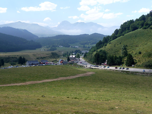 Im Ort Espiadet, etwa in der Mitte der Aspin-Westrampe angesiedelt, macht die Straße einen Schlenker nach Norden, bevor es auf mehreren Kehren duch den Wald weiter Richtung Passhöhe geht. Im Ort, der rechts des Bildes noch etwas weitergeht, liegen mehrere Restaurants direkt an der Straße.