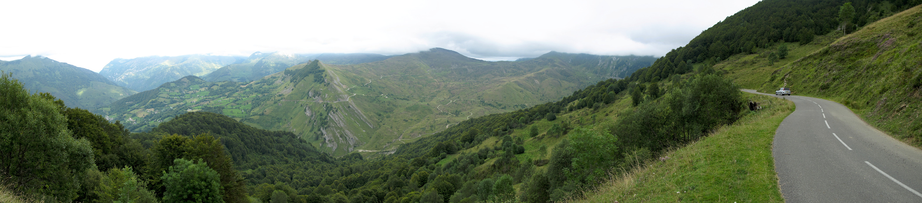 Gegenüber im kahlen Berg ist die Nordrampe und auch die Passhöhe des auf dem Weg liegenden Soulor zu erkennen. Der heftige Teil der Aubisque-Ostrampe ist nur noch ein paar Kilometer entfernt.
