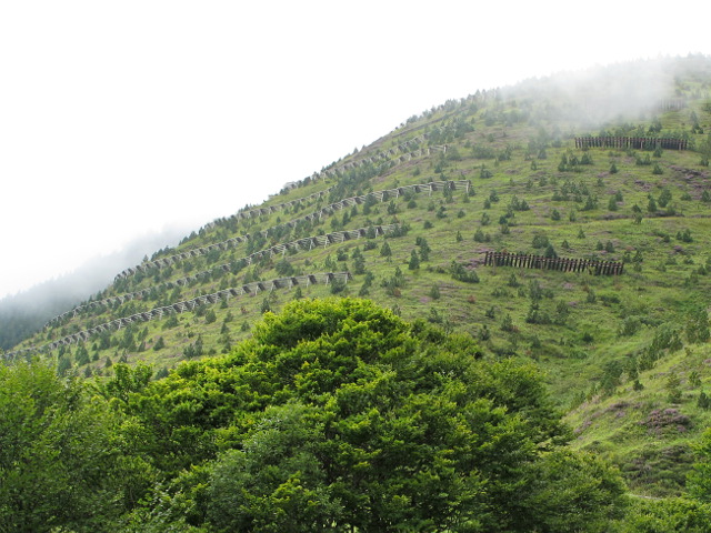 und der Passhöhe sind viele dieser Lawinensperren im Berg zu sehen.
