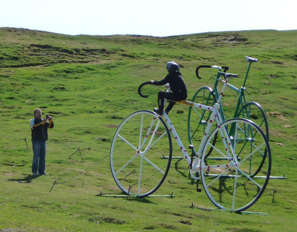 Kurz vor der Passhöhe stehen ein paar überdimensionale Rennräder. Ich habe sie mir nicht aus der Nähe angeschaut, aber ob die Dinger so stabil und für eine Besteigung gedacht waren ... na ich weiß nicht.
