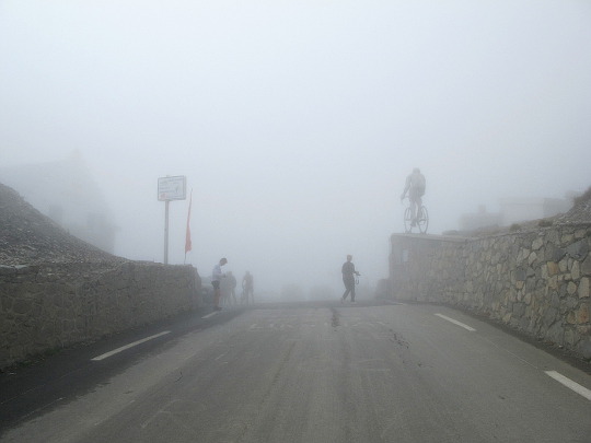Sichtweite 10 Meter, wenn man blassgraue Konturen mitzählt. Die obenrum doch etwas kurvige und gefährliche Westrampe habe ich nur geschafft, weil ich der Nebelschlußleuchte eines Regault Laguna hinterher gefahren bin. Visier von außen naß, von innen beschlagen, Augen tränten, einfach dem roten Punkt hinterher. Wäre der Renault versehentlich den Abhang hinunter gefahren, hätt am nächsten Tag in der Zeitung gestanden "