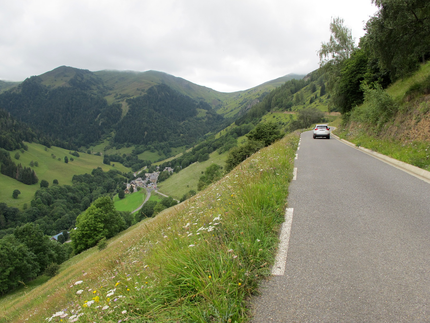 Spätestens ab dem Ort Bourg d'Oueil (links der Bildmitte) wird die Straße sehr schmal und liegt teilweise ohne Absicherung direkt am Hang. Zwar ein wenig gefährlich, aber die Landschaft ist sehr sympatisch.