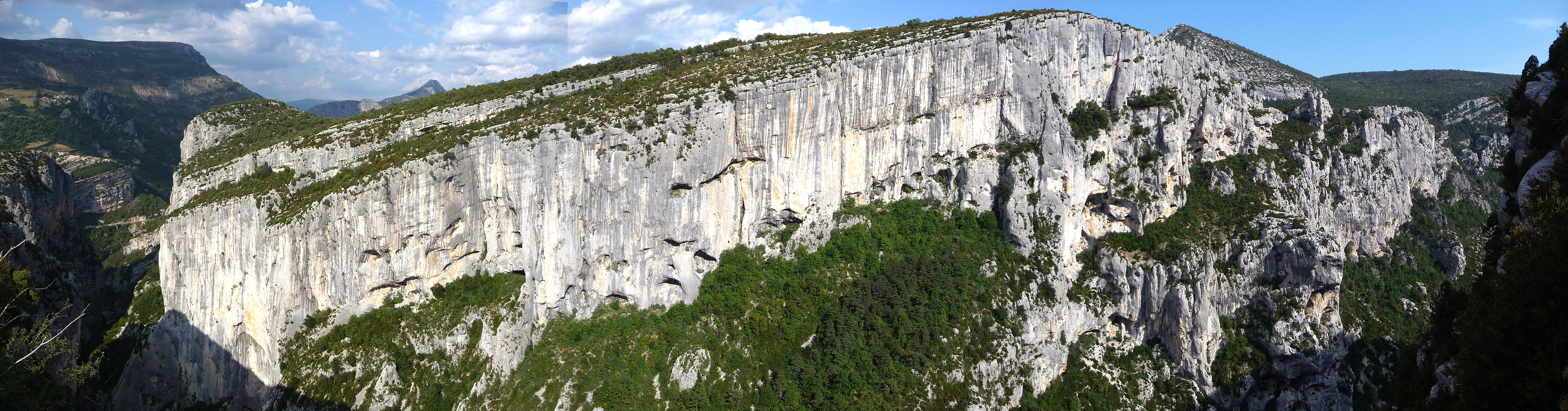 Panoramabild eines mächtigen Felsmassivs, das auf der Ostseite des Collet Barris von der ersten Kehre aus gesehen werden kann. Ganz links ist ein kleiner Teil der Col d'Ayen-Ostrampe zu erkennen, der Fluß Verdon fließt in diesem Fall von links (Norden) nach rechts (Süden).