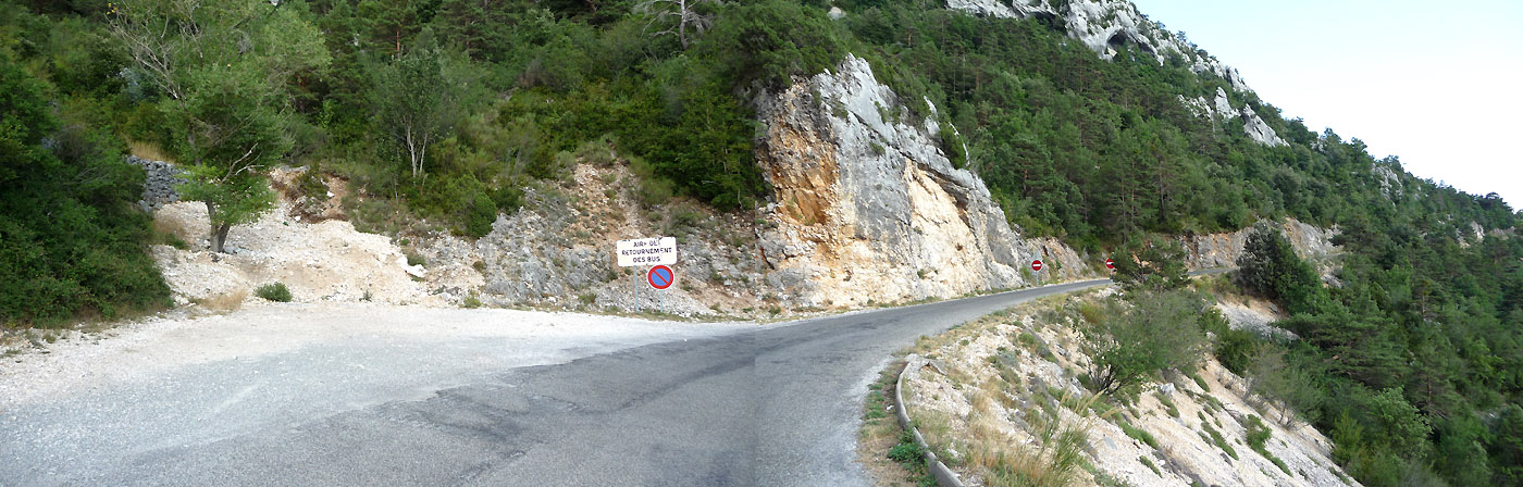 Blick auf den Beginn der Einbahnstraße. Links gibt es eine Wendemöglichkeit, die Autos und auch großen Bussen die Rückkehr ermöglicht. Rechts außerhalb des Bildes befindet sich in 200 Metern Entfernung das Chalet de la Maline.