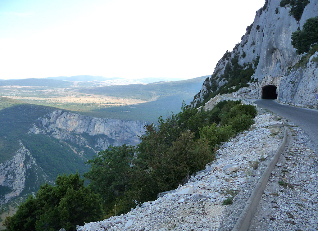 Einer von mehreren Tunneln im oberen Bereich der Westrampe. Links außerhalb des Bildes hat man eine gute Sicht auf diverse Sehenswürdigkeiten, so z.B. den Aussichtspunkt Balcons de la Mescla, die Brücke Pont de l'Artuby und das Tunnel-Galeriensystem Tunnels du Fayet.