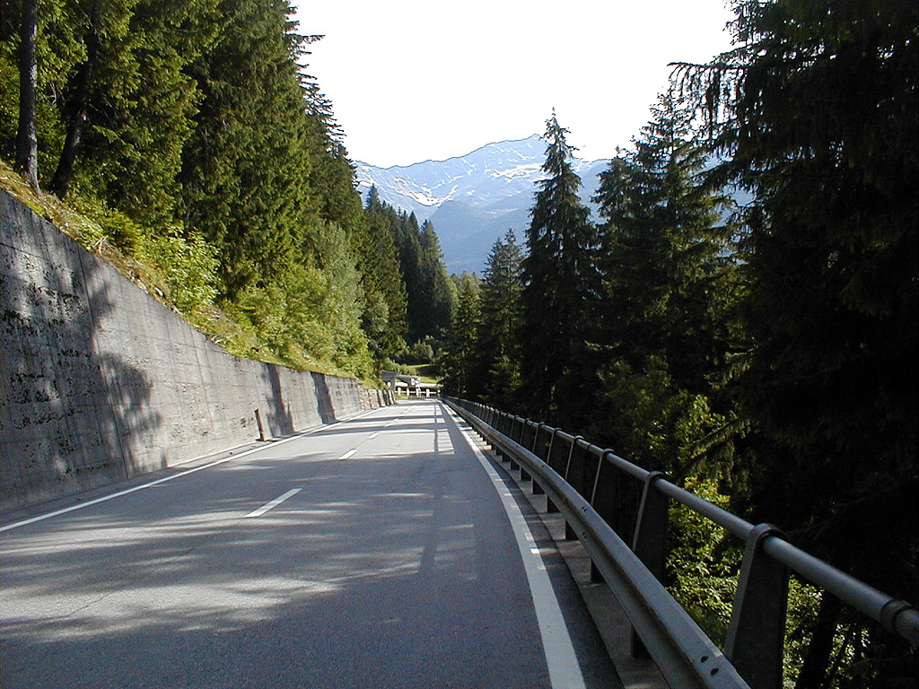 Im mittleren und unteren Teil der Südrampe führt die Straße teilweise an einer Schluchtwand entlang.