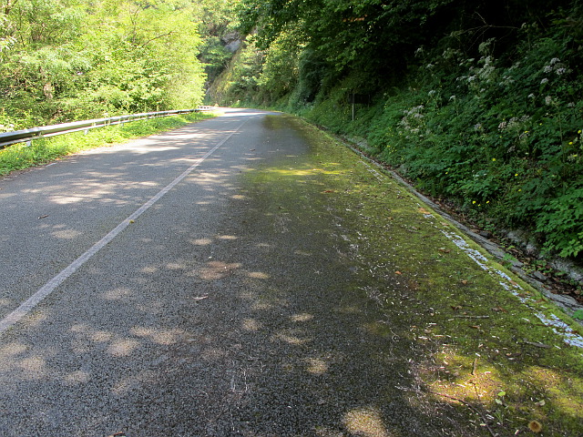 Moos auf einer ansonsten gut asphaltierten und zweispurigen Straße, das ist mir so auch noch nicht untergekommen. Die in vielen kurzen Etappen um die Hauptstraße kurvende Nebenstraße wird kaum verwendet, daher ist in schattigen Bereichen dieser Wildwuchs möglich.