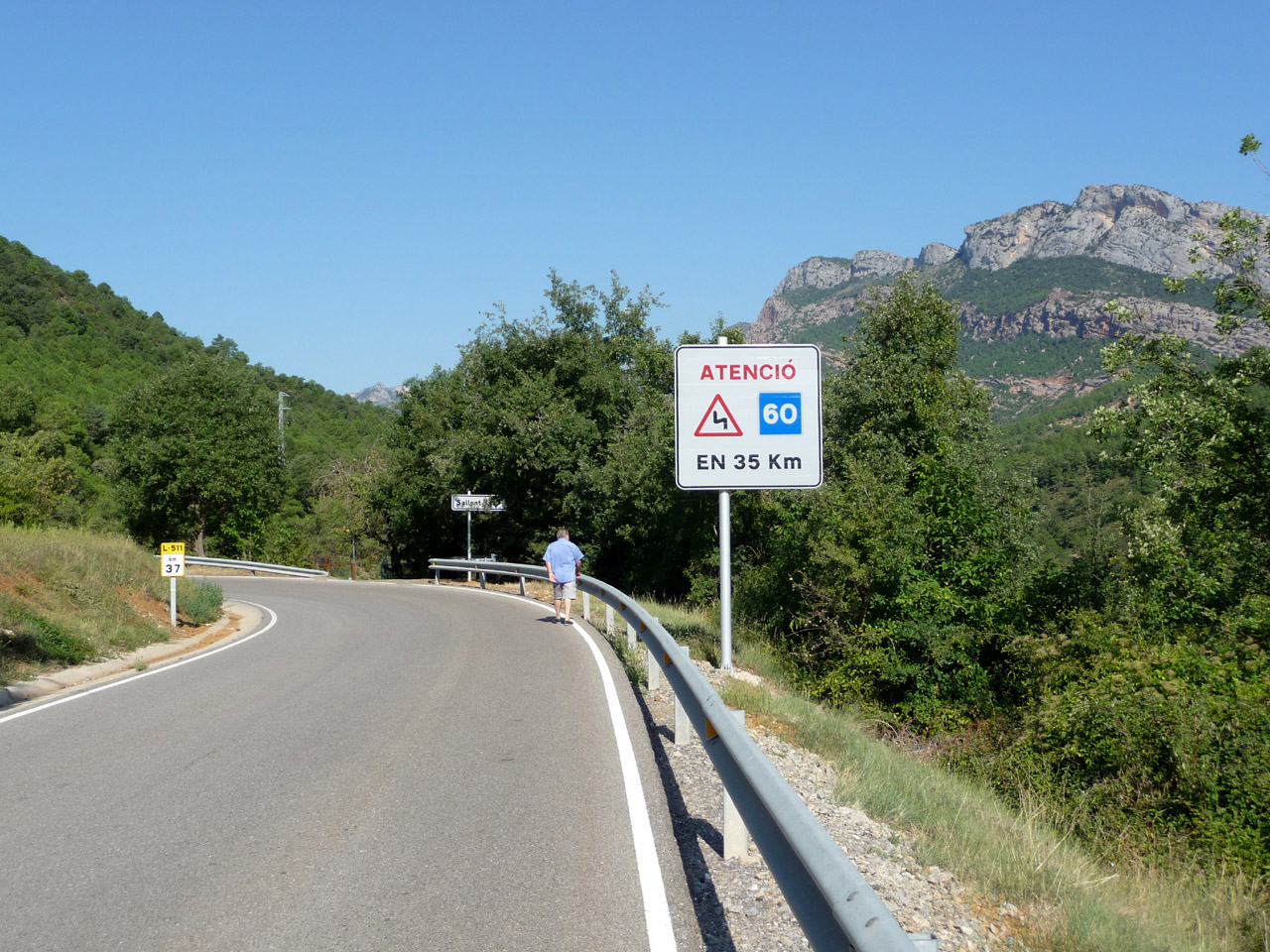 Kurz nach der Einfahrt auf die Ostrampe sieht man dieses Schild, das einen vor bösen und gefährlichen Kurven warnt. Und das auch noch 35 Kilometer am Stück. Links so gerade eben außerhalb des Bildes befindet sich die Einfahrt hin zur Schotterpiste durch die Sierra de Aubenç(i).