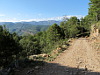 Hat man einen Kilometer später den wirklich höchsten Punkt passiert und fährt wieder nach unten, fällt einem als erstes ein beeindruckendes Felsmassiv ins Auge. Auch durch die Bewaldung scheint es immer wieder hindurch. Je tiefer man fährt, umso mehr füllt es den Sichtbereich aus und verläuft sich nach Osten im Horizont. Wiedereinmal gibt auch ein Panoramabild aus 3 Weitwinkelaufnahmen den Anblick leider nicht ganz wieder. Die rechts abzweigende Schotterpiste ist die nördliche Zufahrt zum Anfangs erwähnten Sallent(i), der Runde um den Sant Joan(i) und dem Apallador(i).
