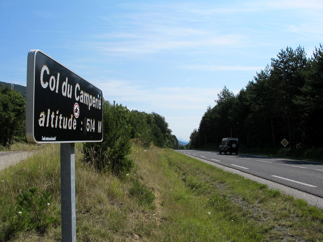 Der Blick geht nach Osten. Die Straße hinter dem Passschild führt zu der Raststelle, die etwas versteckt hinter der eigentlichen Passhöhe liegt. Dort ist auch die Einfahrt in den Forêt des Fanges und hoch zum geschotterten Col del Fraiche(i) zu finden.