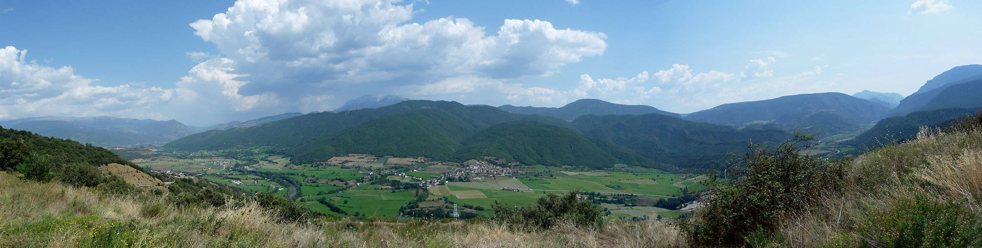 Blick ins Tal, aufgenommen aus dem unteren Bereich der Ostrampe. Im Bild ist der Ort El Pla de Sant Tirs und der durchs Tal fließende El Segre (bzw. Rio Segre) zu sehen, das Ende der Ostrampe in Adrall liegt knapp einen Kilometer weiter nördlich (links).