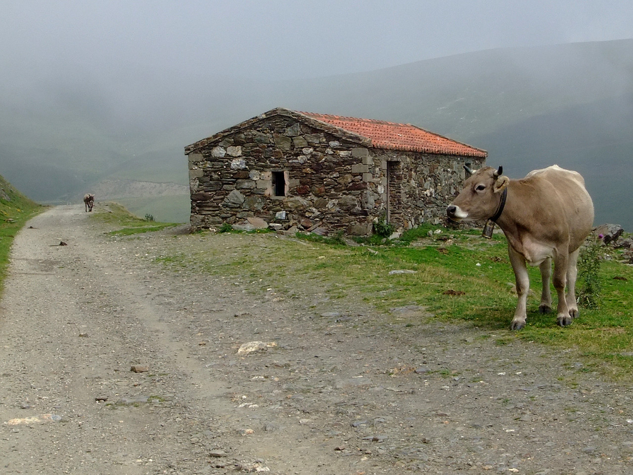 Mitten auf der Strecke steht eine alte Hütte, viele Kühe und ein paar Esel laufen in der Gegend rum.