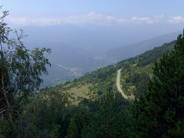 Schöner Blick ins Tal nach rund einem Drittel der Westrampe, von der ein Stück rechts im Bild zu sehen ist. Links der Bildmitte kann in der Ferne Ribes de Freser erkannt werden, in dem die Ausschilderung nicht die Beste ist.