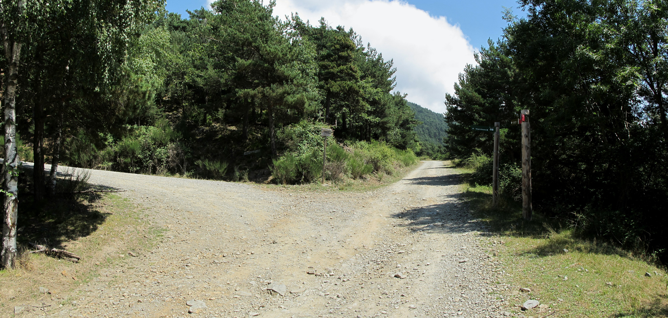 Knapp 7 Kilometer hinter der Einfahrt trifft man auf diese Kreuzung. Links geht es zum Refugi Ribesaltes, geradeaus weiter auf die Runde und letztendlich nach Tregurà.