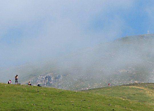 Kurz vor der Passhöhe wird aus Schotter Beton. Eine Spur breit, bis oben, kein Problem. Simple Passhöhe, Wanderer en Mas.