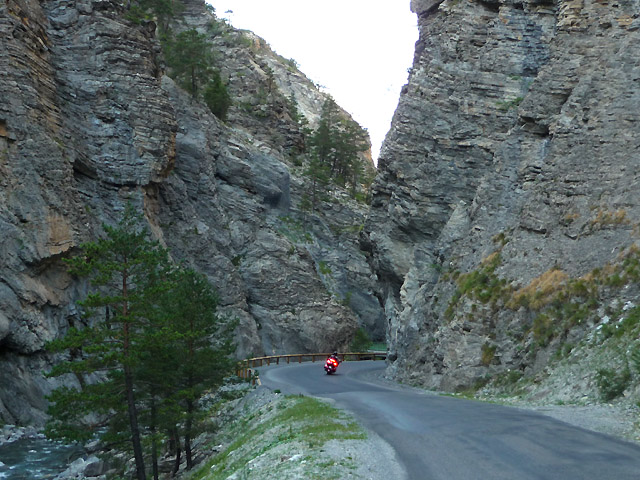 Blick in den untersten Teil der Gorges du Bachelard. Wenige 100 Meter hinter dieser Stelle wird der Straßenverlauf geradliniger, der interessante Teil der Passfahrt ist dann vorbei.