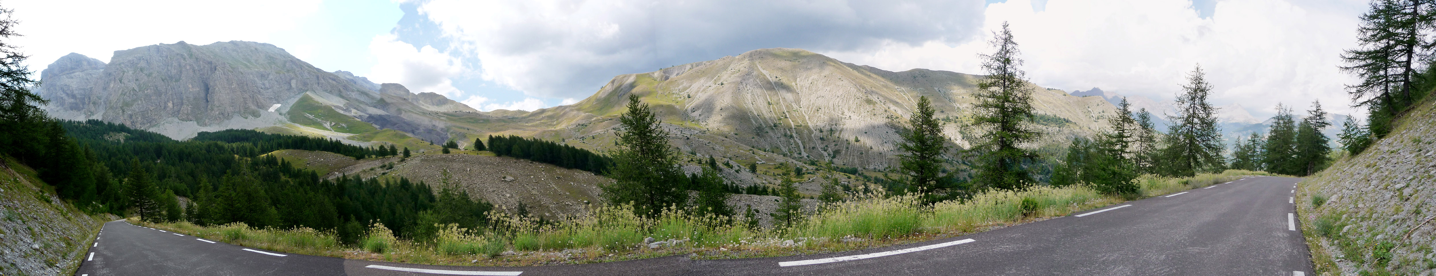 Das Panoramabild besteht aus 4 Einzelaufnahmen. Rechts geht es hoch zur Passhöhe, links weiter ins Tal.