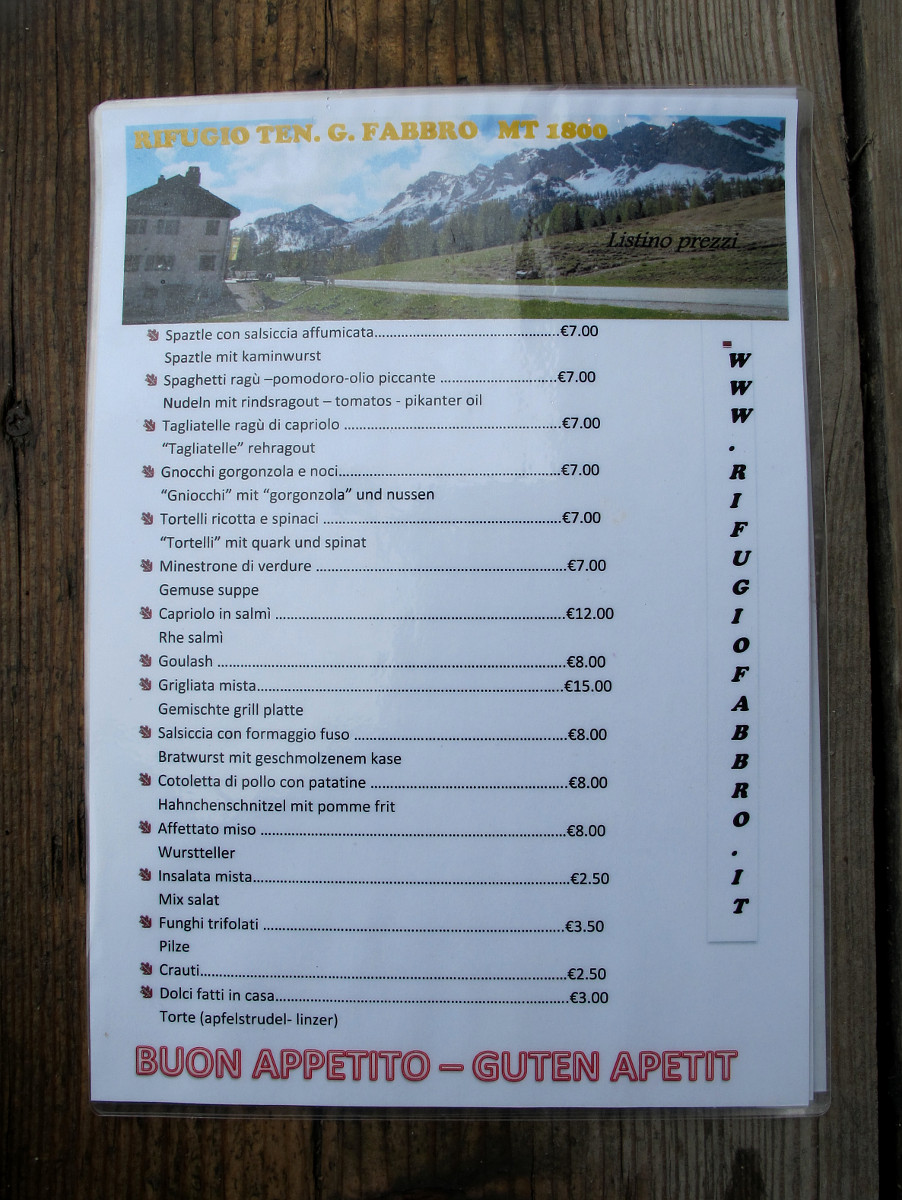 Die Preisliste des Rifugio Alpino Ten Fabbro enthält ein paar Übersetzungsfehler, aber mit ein bisschen Phantasie können alle Gerichte erraten werden. Bild und Preise stammen aus dem Jahr 2011.