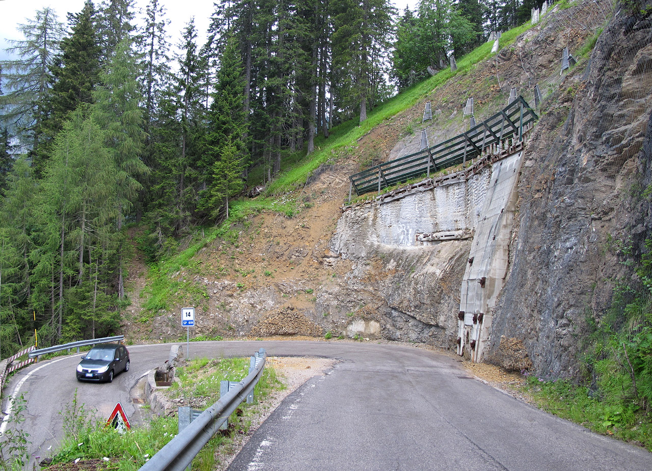 Die Felswand fällt teilweise senkrecht auf die Straße ab und ist häufig mit Steinschlaggittern abgesichert.