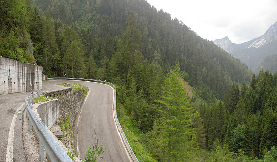 Val Pesarina. Es ist trotz einiger Geraden mindestens im oberen Teil schön zu fahren. Gemütlicher Wald mit vielen hohen Bäumen wartet auf die Reisenden.