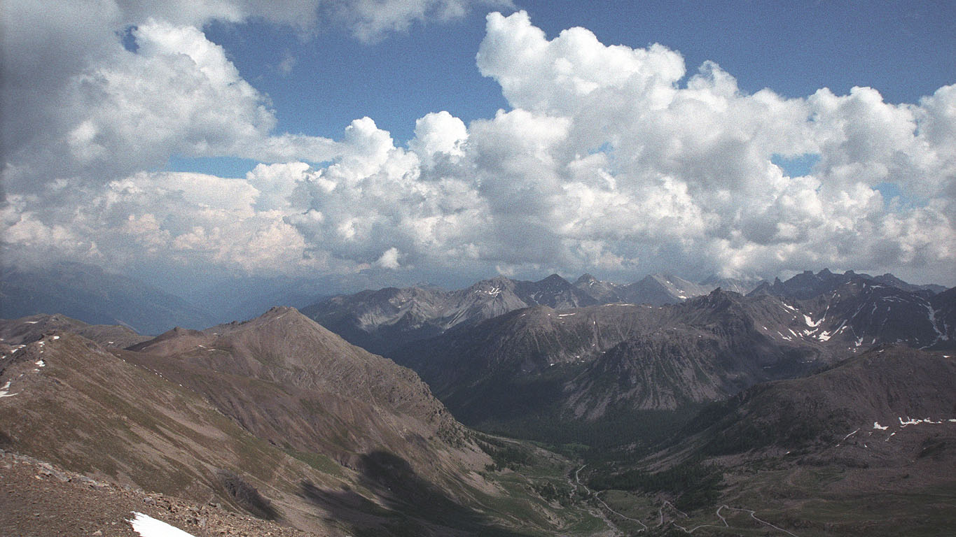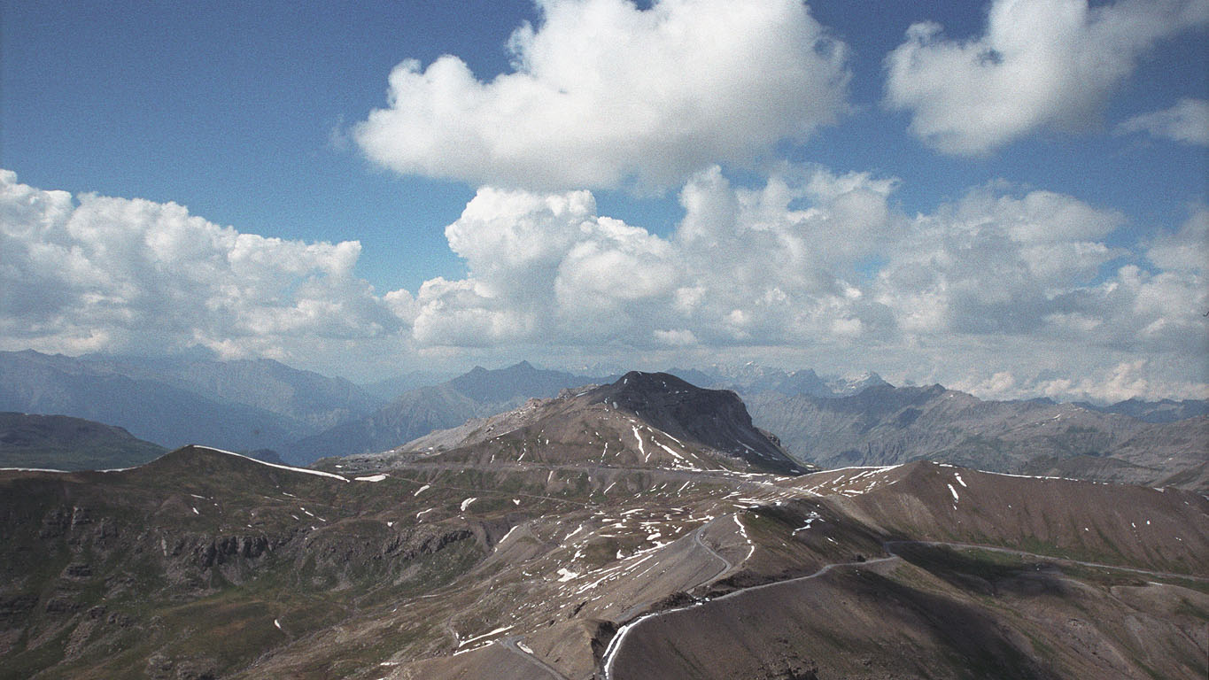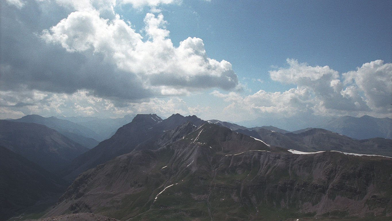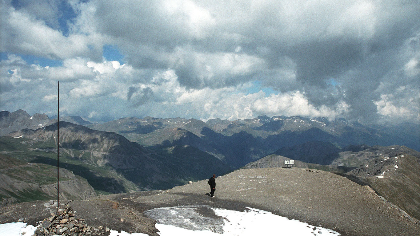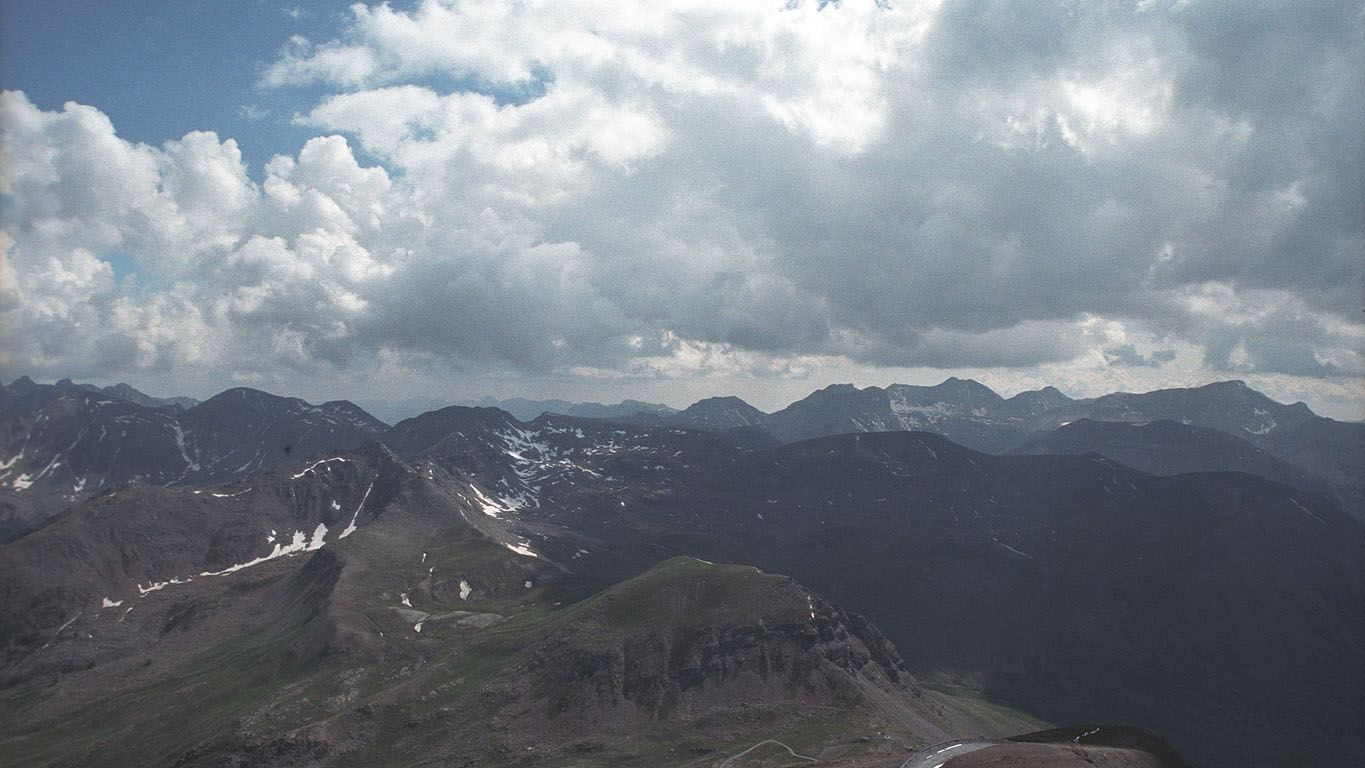 Die Aussicht kann sich sehen lassen. Berge ringsherum, allerdings in der Nähe keiner der die Sicht versperrt. Damals habe ich den Versuch unternommen, genügend Bilder für eine Panorama-Ansicht aufzunehmen. Mit einer herkömmlichen Chemo-Kamera, was die schlechte Qualität erklärt. Dennoch sind ein paar Dinge zu erkennen, so zum Beispiel ganz rechts Passhöhe Nummer 1.