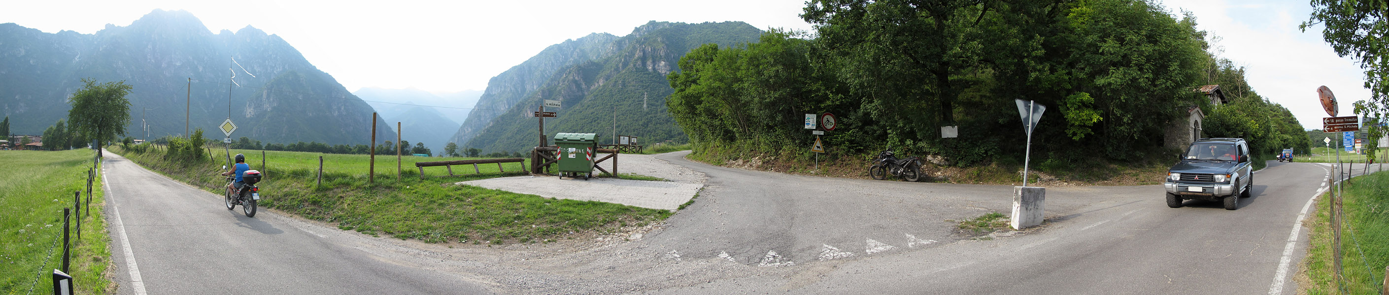 Blick auf die südliche Einfahrt des Cocca, sehr schön ist der Bergeinschnitt zu sehen, durch den das Valle San Michele sich seinen Weg bahnt. Die Hauptstraße führt linke Hand auf schön kurvigem Terrain nach Süden und hinaus aus dem Gebiet Tremosine, rechts erreicht man nach weniger als zwei Fahrkilometern den Ort Vesio.