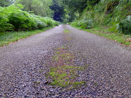 Wobei die ganze Rampe eigentlich nur eine Spur breit ist, aber für gewöhnlich passen auf dem Rest der Strecke alle vier Reifen eines Autos gleichzeitig auf den Asphalt. Der über viele Kilometer von einer Gras- oder Moosschicht verziert wird, was gewiss eine seltene Angelegenheit ist.