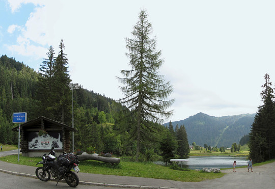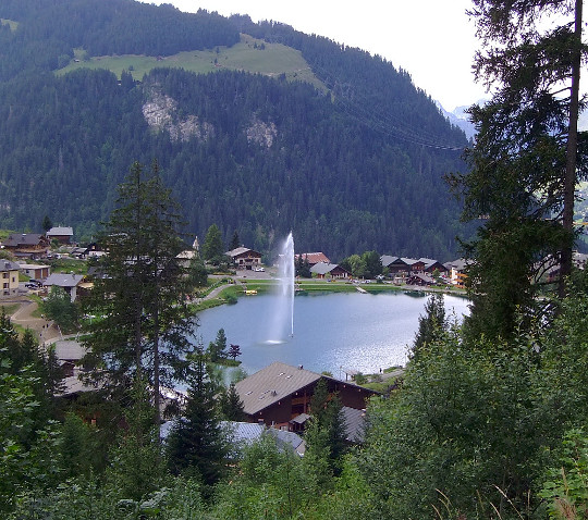 Châtel, dem letzten Ort vor der Passhöhe, kann an einem schönen See inklusive Springbrunnen pausiert werden.