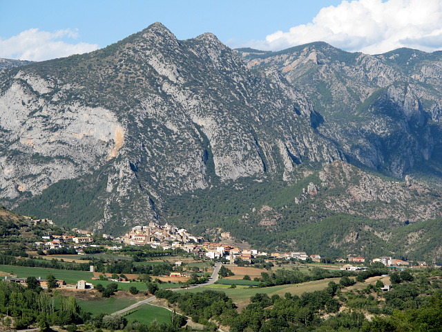 Von der Ostrampe der Schotterpiste durch die Sierra de Aubenç(i) kann der Talort des Coll de Bóixols von oben gesehen werden. Die Straße unterhalb der Bildmitte sind die ersten Meter dessen Ostrampe.