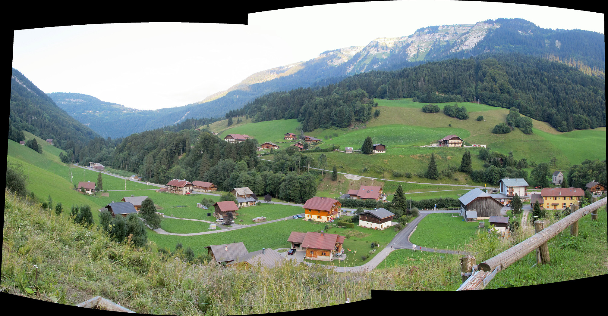 Der Ort Le Reposoir teilt die Nordrampe in zwei Hälften. Zudem treffen hier die mehr nach Norden führende D4 (verläuft unterhalb des Wäldchens links der Bildmitte) und die einen östlichen Bogen beschreibende D119 aufeinander (oberhalb des Wäldchens).