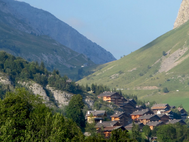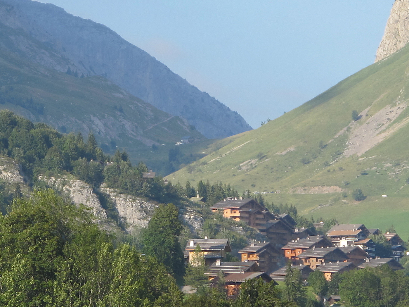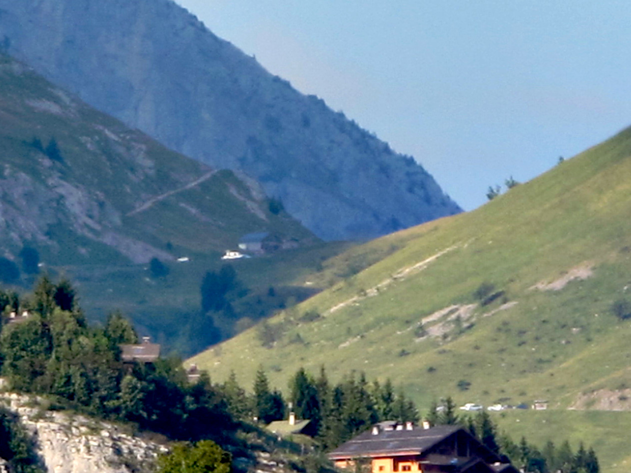 Aus den letzten Ortschaften heraus kann die Passhöhe bereits erspäht werden. In der Bildmitte ist das Restaurant zu erkennen, am Fußweg links darüber zu identifizieren, der auch auf dem Panorama der Passhöhe zu sehen ist.