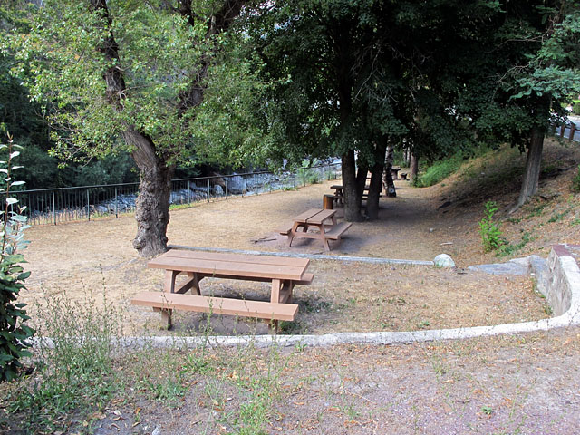 Dieser Rastplatz nahe Wasser und unter Bäumen befindet sich fast ganz am unteren Ende der Ostrampe. Die führt hinter den Bäumen von links nach rechts, trifft dann rechts außerhalb des Bildes auf die Hauptstraße. Der angepriesene Campingplatz liegt im Rücken des Betrachters.