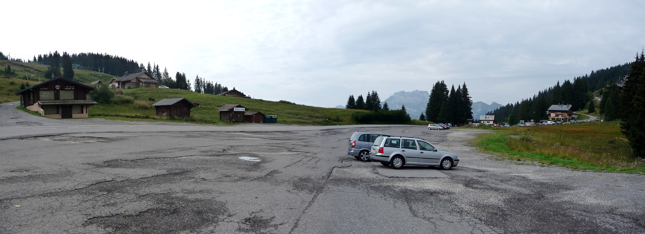 In der Mitte der ca. 500 Meter langen Passhöhe befindet sich ein sehr großer Parkplatz. Rechts im Bild beginnt die Westrampe, im Rücken des Betrachters steht das Hotel, das sich direkt am Anfang der Ostrampe befindet.