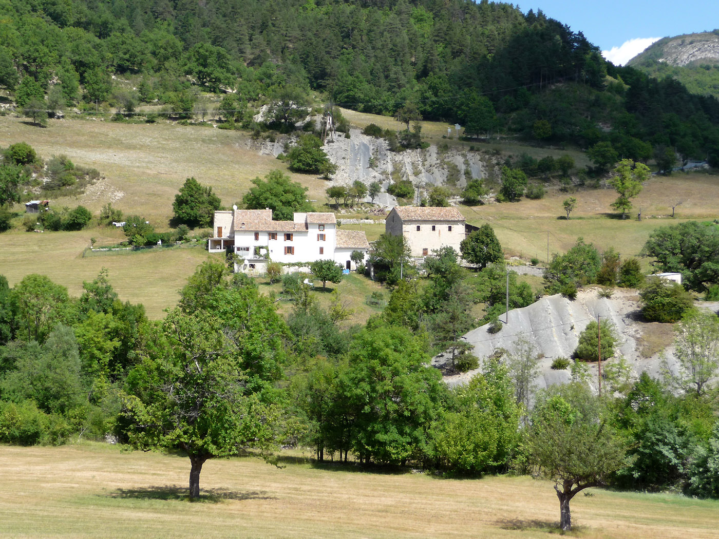 Der komplette Ort La Serre in einem Bild festgehalten, fotografiert von den ersten Metern der D610, die in diesem Bereich noch D710 heißt. Vom der Stelle der Aufnahme aus geht es nach links in die Schlucht der D610, nach rechts zum Co du Buis.