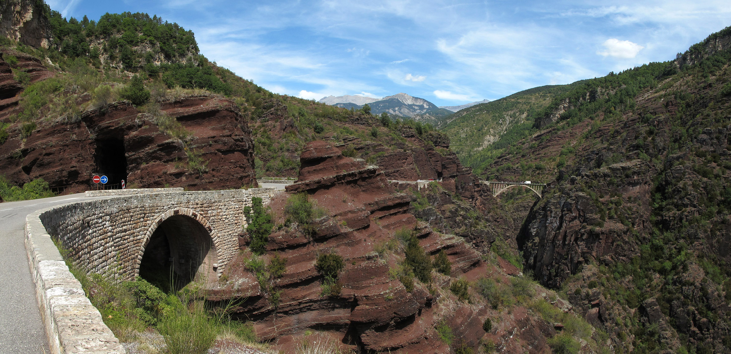 Links der Bildmitte wird die Fahrbahn aufgeteilt. Während Nordsüdler durch viele Tunnel fahren müssen, werden Südnordler im Freien direkt am Abhang entlang geführt. Rechts der Bildmitte ist die Brücke zu erkennen, von der aus Bungee-Jumping angeboten wird.