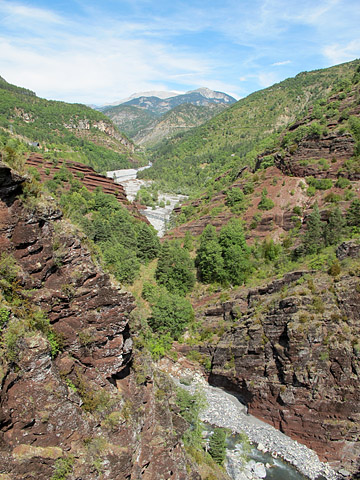 Von der Pont de la Mariée am nördlichen Ende der Gorges Daluis(i) kann nach Norden auf die untersten Meter der Valberg-Westrampe geschaut werden. Im Berg in der Bildmitte kann sie als leicht beige Linie erkannt werden. Aus der Richtung habe das entsprechende Gegenfoto aufgenommen.