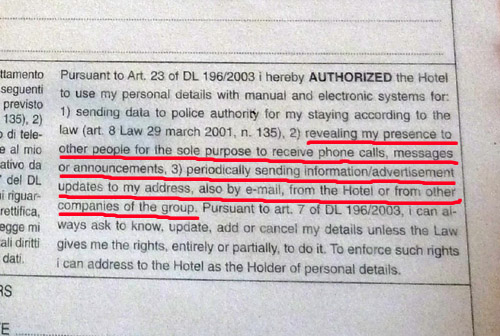 Tut mir zwar Leid, das ich hier auf meiner phantastisch frequentierten Webseite negatives von dem ansonsten sympatischen Hotel in Bella Italia berichten muss, aber sowas finde ich ziemlich für'n Po. Wobei der Übeltäter in diesem Fall wahrscheinlich nicht das Hotel als vielmehr die übergeordnete Organisation oder der Hotelverband ist, was die Sache für mich aber auch nicht erträglicher macht.