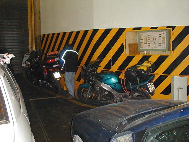 Mein Motorrad (die rechte der beiden Maschinen) im Inneren der Fähre. Sie wurde mittels Gurten an den Wänden und an Verankerungen im Boden festgemacht, damit sie in rauher See nicht etwa umkippt. Links am Bildrand ist die vordere Ladeluke zu sehen, durch die es im Zielhafen aus der Fähre geht.