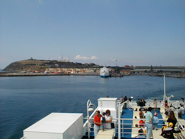 Der Hafen von Piombino, wenige Minuten nachdem die Fähre Richtung Elba Fahrt aufgenommen hat. Ganz rechts ist die Anlegestelle noch zu erahnen, links ist der südlichste Zipfel der Landzunge um Piombino zu sehen.