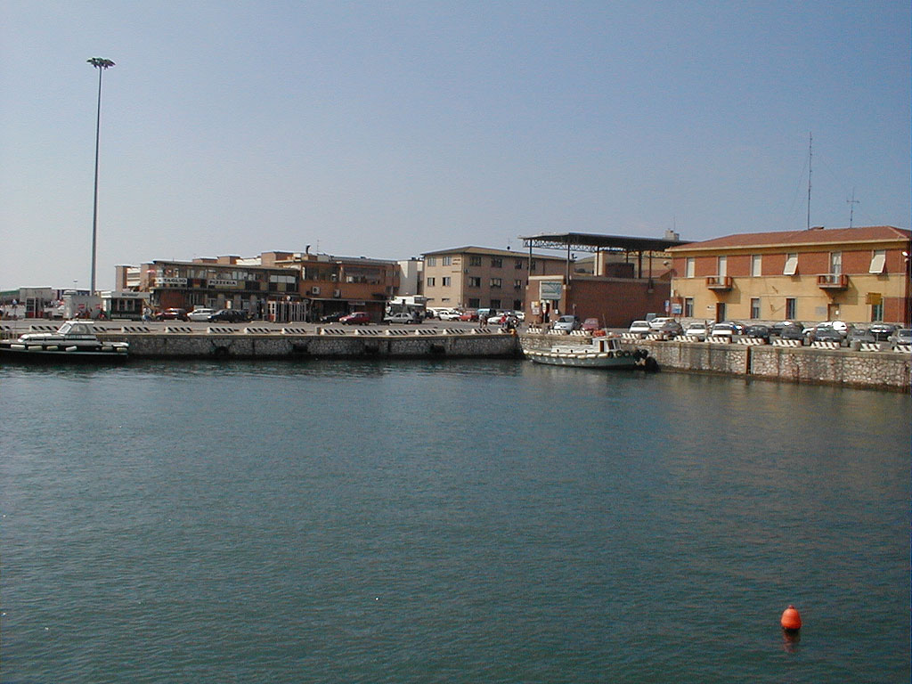 Blick in einen Teil des Hafens von Piombino, aufgenommen von der Fähre aus, kurz nachdem sie abgelegt hat. Ziemlich genau in der Bildmitte, hinter dem halbhohen Haus mit der 'überdachten Terasse', ist die Ticketbude zu finden.